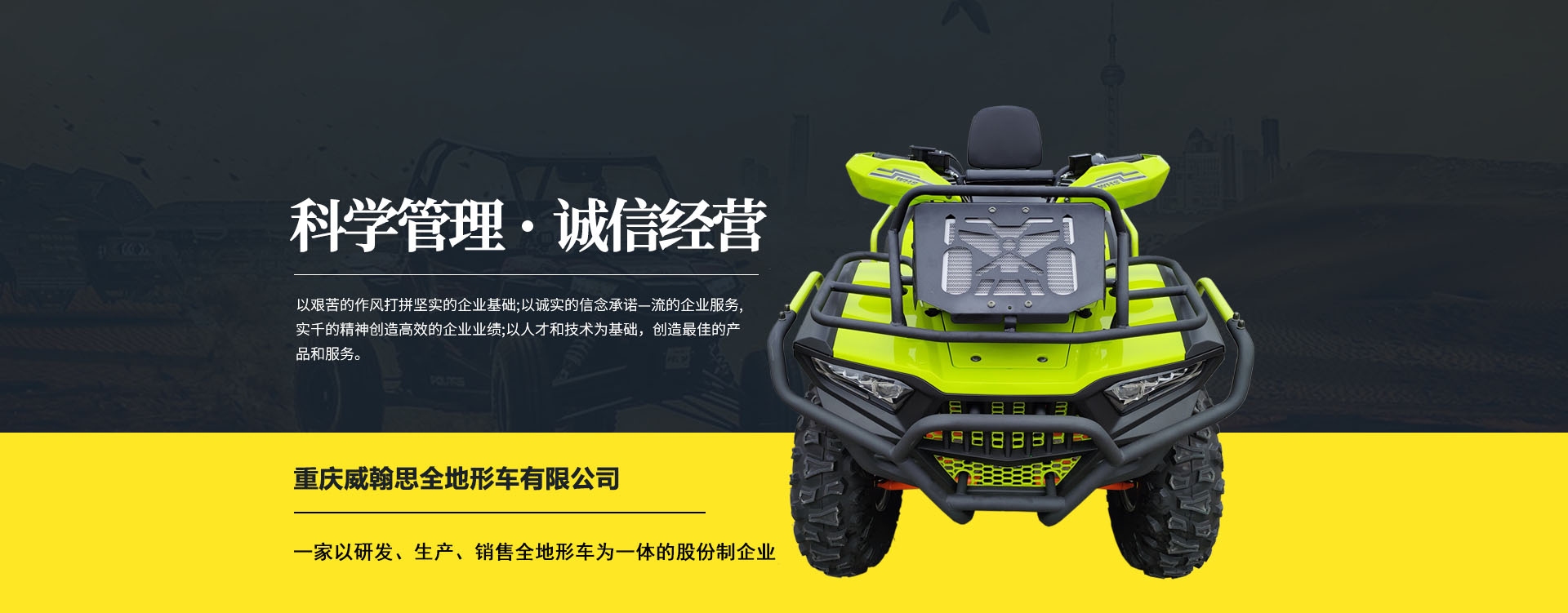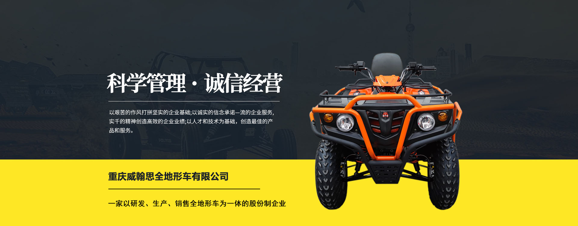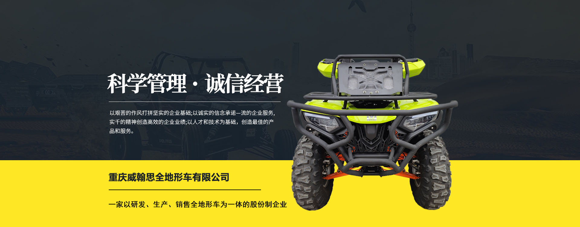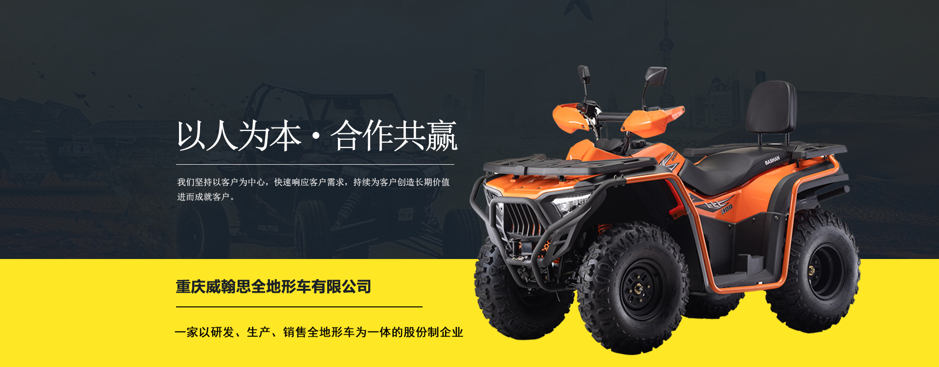 重慶威翰思全地形車有限公司成立于2016年9月,一家以研發、生產、銷售全地形車為一體的股份制企業。公司銷售額超過5000萬。現有專業市場售后服務團隊。公司秉承“敬業、超越、活力、用戶至上”的企業精神,“以人為本,合作共贏;”的核心價值觀,“嚴格管理創優質、名牌戰略拓市場”的質量方針,使公司一步步邁上新的臺階。公司與重慶航天巴山摩托車制造公司達成戰略合作協議。共同出資致力于沙灘車旅游市場產品研發,項自運營指導,市場維護等全方位市場拓展。重慶航天巴山摩托車制造公司授權;重慶威翰思全地形車有限公司為中國區唯─戰略合作伙伴。